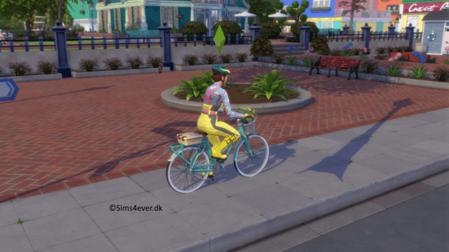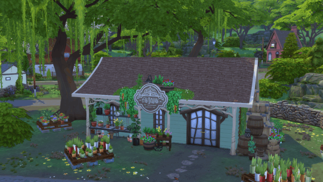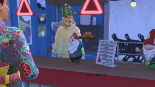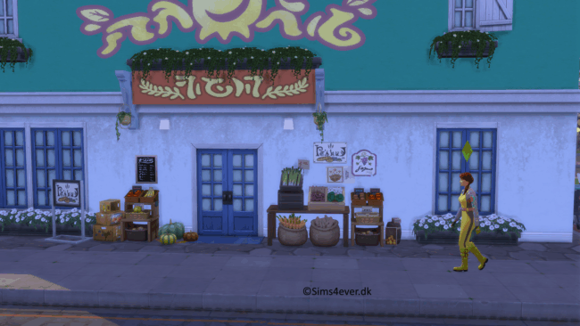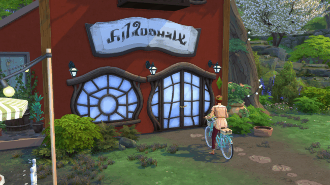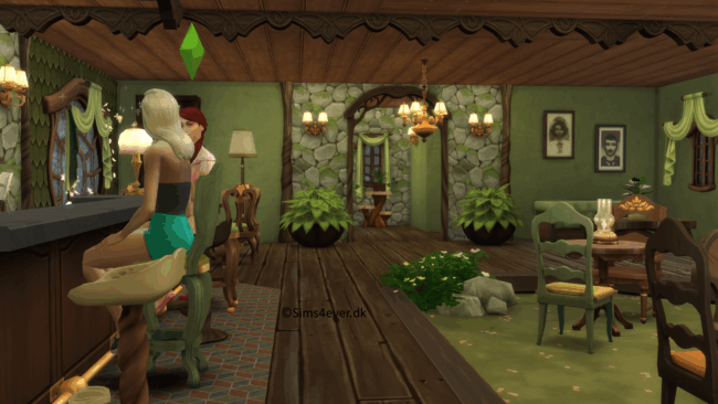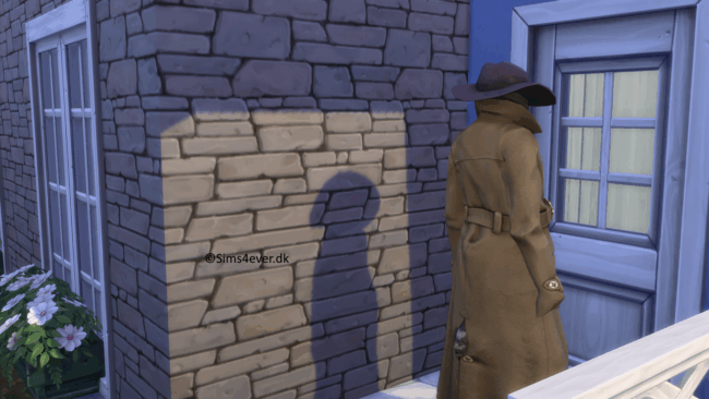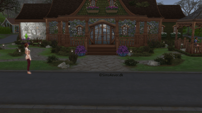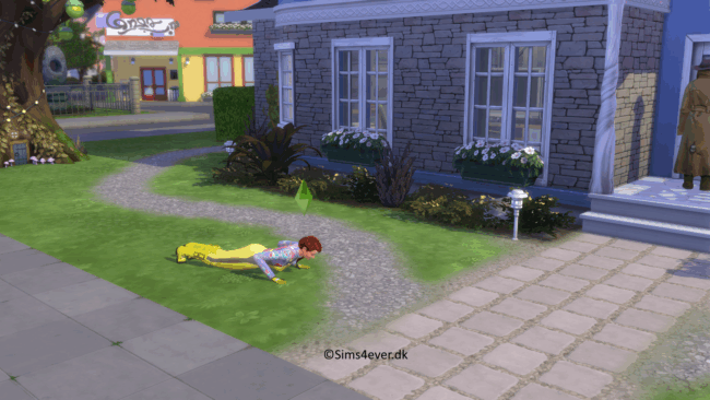 New shopping options have been created. Just like in Sims 3, you can now shop in permanent stores. Where your sim “disappears” into the store and you can choose what you want to buy.visits a small snack place. He also sells elves. Eva buys a piece of apple pie.after the shoping – Eva heads homeThis is where Eva lives. I have decorated the surroundings a bit, including removing the fence and adding a hedge. I have also rearranged the interior of the house.Back home, Eva sees a mysterious person standing at the front door – Hmm, I wonder who it is?Well, I’ll wait until that person leaves again and in the meantime I can exercise a little.